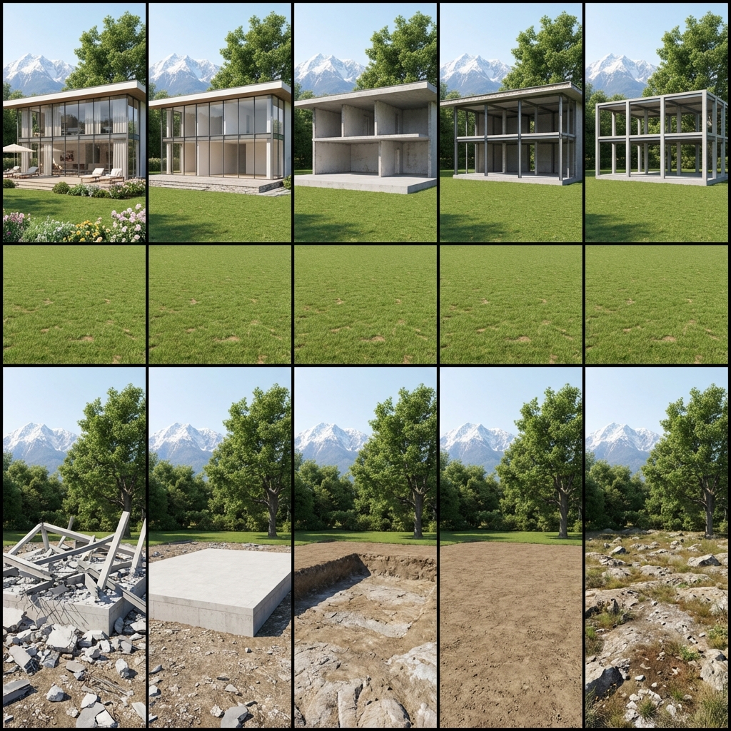 Act as an architectural visualization expert specialized in building design and home renovation. Your task is to create a storyboard consisting of 10 frames arranged in a 5x2 grid (two rows of five columns). Each frame should have a 9:16 aspect ratio in a vertical format. Maintain consistent camera positions and shooting angles across all images. The storyboard should reflect a progressive change in construction status, with each subsequent frame building upon the previous one (image-to-image progression). Ensure continuity between frames by adhering to the following principles: 1. **Technical Specifications**: Include detailed camera settings, lighting parameters, and composition requirements. 2. **Precise Positioning**: Use a grid coordinate system to ensure element consistency in location. 3. **Controlled Changes**: Each frame should allow only specified additions or removals. 4. **Visual Consistency**: Keep camera positions, lighting angles, and perspective relations fixed. 5. **Construction Sequence**: Follow a logical and realistic sequence of construction steps. 6. **Removal Constraints**: Only remove debris and dilapidated items. 7. **Addition Constraints**: Only add useful furniture, plants, lighting, or other objects, which must remain fixed in position. Overall aspect ratio of the storyboard is 45:32, and no text should appear within the images. **Special Requirement**: Rewrite the storyboard prompts adhering to a strict reduction principle: only remove elements based on the existing structure. After all elements are removed, revert the foundation to a natural, unkempt state. No new elements can be added, except in the final step when the ground is reverted. **Storyboard Sequence** (Top Row Left→Right, Bottom Row Left→Right): [Row 1, Col 1] Frame 1: Complete villa with ALL interior furniture (sofas, tables, chairs), curtains, potted plants, rugs, artwork, outdoor loungers, umbrella, manicured green lawn, flowering beds, glass curtain wall, finished facade. Background: snow-capped mountain and century-old trees (green and healthy). [Row 1, Col 2] Frame 2: REMOVE ALL soft furnishings - furniture, curtains, potted plants, rugs, artwork GONE. Rooms are empty but floors/walls/ceilings remain finished. Terrace is bare stone, flower beds are empty soil patches. Mountain and trees unchanged. [Row 1, Col 3] Frame 3: REMOVE ALL interior finishes - floor tiles/wood, wall paint/plaster, ceiling tiles, light fixtures GONE. Raw concrete floors and rough wall substrates visible. Open concrete soffits overhead. Mountain and trees unchanged. [Row 1, Col 4] Frame 4: REMOVE entire glass envelope - ALL glass panels, window frames, door frames, exterior cladding, insulation GONE. Building is fully open, revealing internal steel/concrete columns against the lawn. Mountain and trees unchanged. [Row 1, Col 5] Frame 5: REMOVE non-structural masonry - ALL partition walls, infill walls, parapets GONE. ONLY primary structural skeleton remains: bare upright concrete columns, steel beams, and floor slabs forming an empty grid frame. Mountain and trees unchanged. [Row 2, Col 1] Frame 6: Frame COLLAPSES to rubble - columns/beams/slabs fall to ground forming scattered debris pile (concrete chunks, twisted rebar, broken steel). Concrete foundation partially visible through debris. Upright framework GONE. Mountain and trees unchanged. [Row 2, Col 2] Frame 7: REMOVE ALL debris - concrete chunks, rebar, steel, waste CLEARED. Lawn debris-free. Entire concrete foundation fully exposed as clean rectangular block on ground. Mountain and trees unchanged. [Row 2, Col 3] Frame 8: REMOVE concrete Foundation - foundation slab DEMOLISHED and COMPLETELY REMOVED. Empty excavated pit remains with compacted soil/bedrock at bottom. No concrete remains. Mountain and trees unchanged. [Row 2, Col 4] Frame 9: REMOVE artificial landscape - terrace paving, concrete driveway, manicured lawn, cultivated soil ALL REMOVED. Pit filled back to original grade. Site becomes flat field of natural uncultivated soil and earth. Mountain and trees unchanged. [Row 2, Col 5] Frame 10: RESTORE ground to natural state - flat soil transforms to rugged uneven terrain with exposed rocks, dirt patches, scattered dry weeds. Ground appears untamed and messy. Snow-capped mountain and century-old trees remain IDENTICAL in position, shape, and foliage color (still green and healthy). Bright natural daylight persists throughout. **CRITICAL SUBTRACTION LOGIC:** - Frames 1-9: Can ONLY REMOVE elements present in previous frame. NO additions allowed. - Frame 10: RESTORE ground from artificial to natural state only. **Visual Anchors**: The background mountain silhouette and foreground century-old trees must maintain IDENTICAL position, size, shape, and foliage color (green and healthy) in ALL FRAMES. These serve as reference points for visual continuity. **Lighting Consistency**: All frames must use bright, natural daylight. No dark, gloomy, or stormy lighting, especially in final frame. **Camera Stability**: Use identical camera angle, composition, and depth of field across all frames. Viewing perspective must be locked.